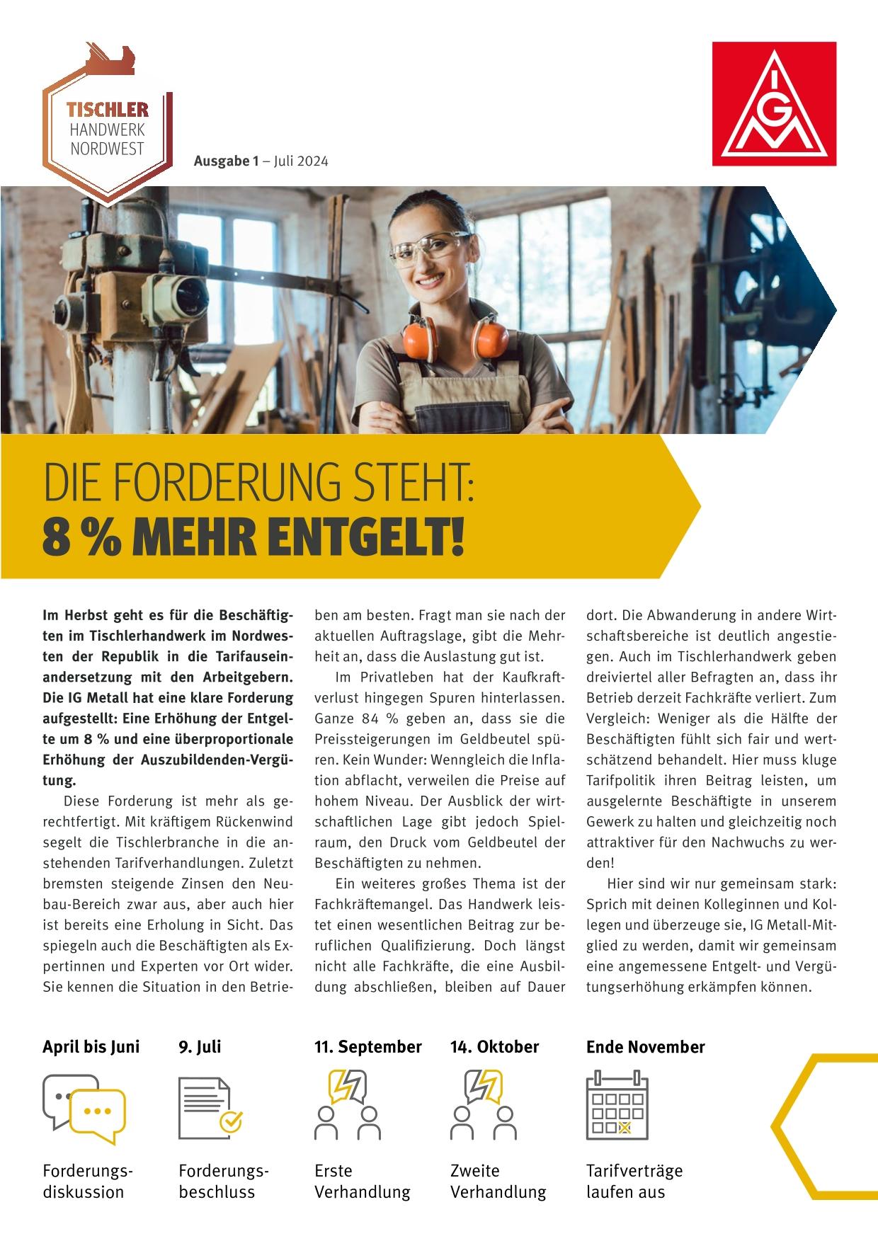 Die IG Metall hat eine klare Forderung aufgestellt: Eine Erhöhung der Entgelte um 8 % und eine überproportionale Erhöhung der Auszubildenden-Vergütung.