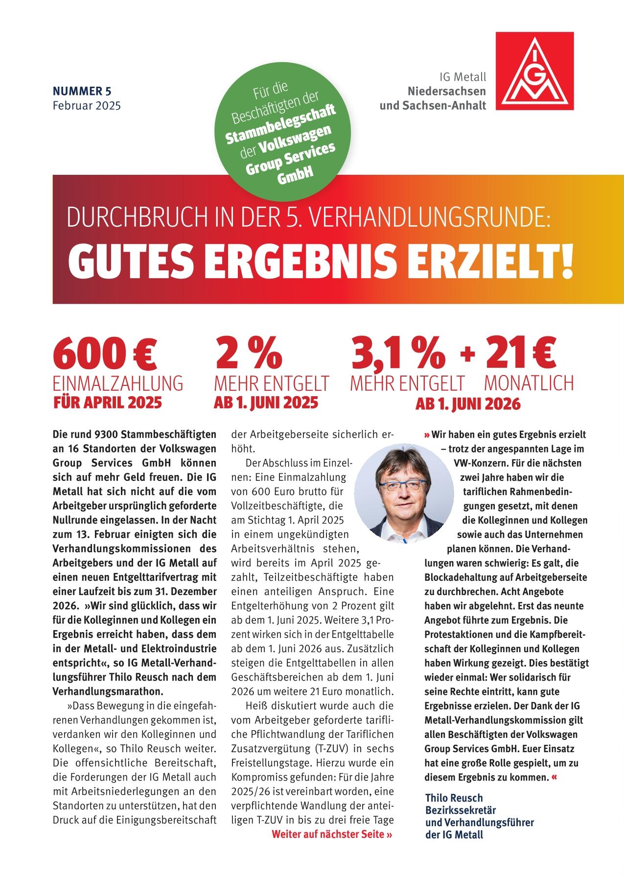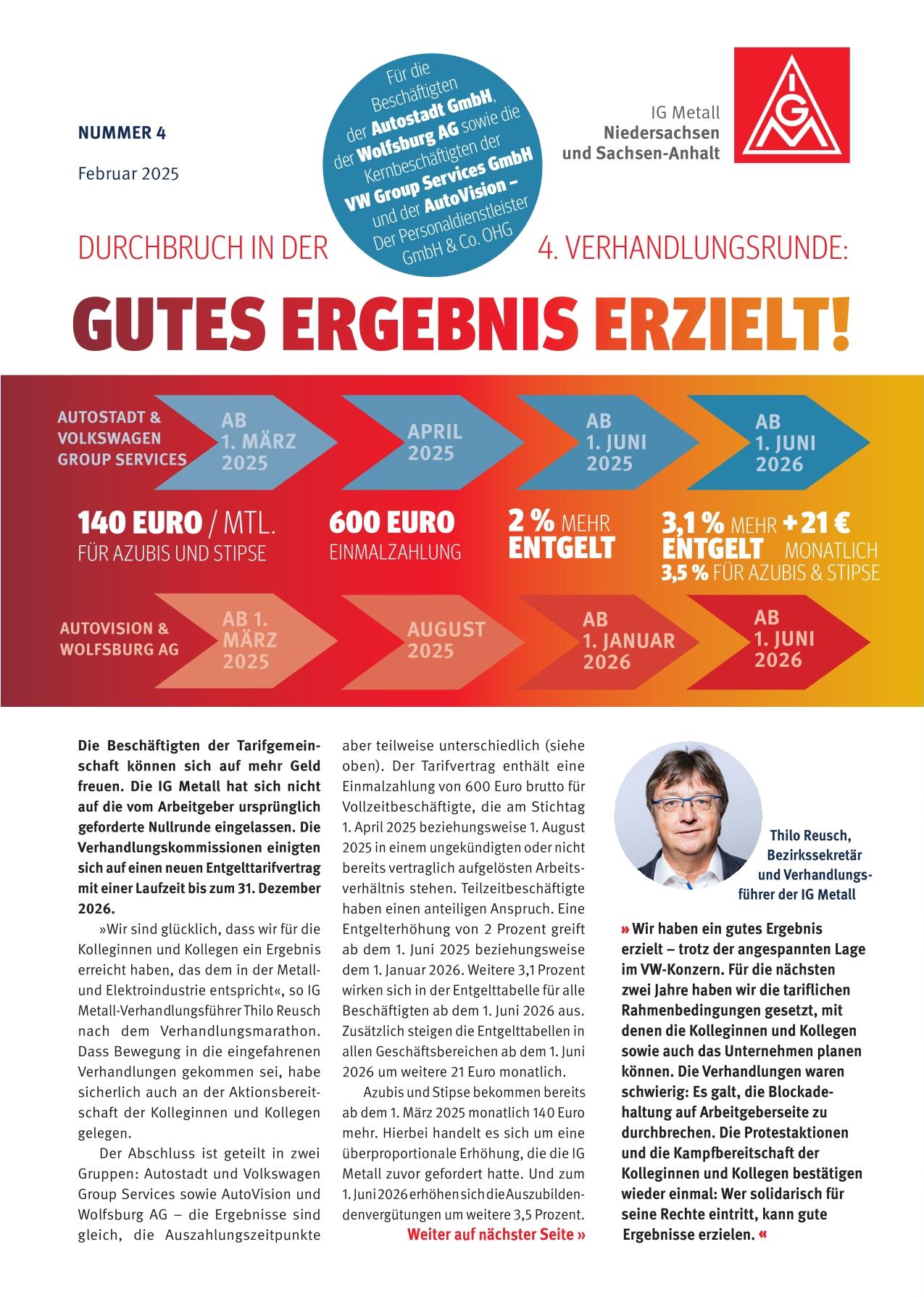 „Dieses Verhandlungsergebnis ist ein gutes Resultat für unsere Kolleginnen und Kollegen. Zunächst erhalten sie eine Einmalzahlung von 600 Euro, bevor die Entgelte in zwei Stufen um zunächst 2,0 und dann 3,1 Prozent dauerhaft steigen. Zusätzlich erhöhen sich die monatlichen Tabellenwerte um einen Sockelbetrag, wovon insbesondere die unteren Entgeltgruppen überproportional profitieren“, so IG Metall-Verhandlungsführer Thilo Reusch.