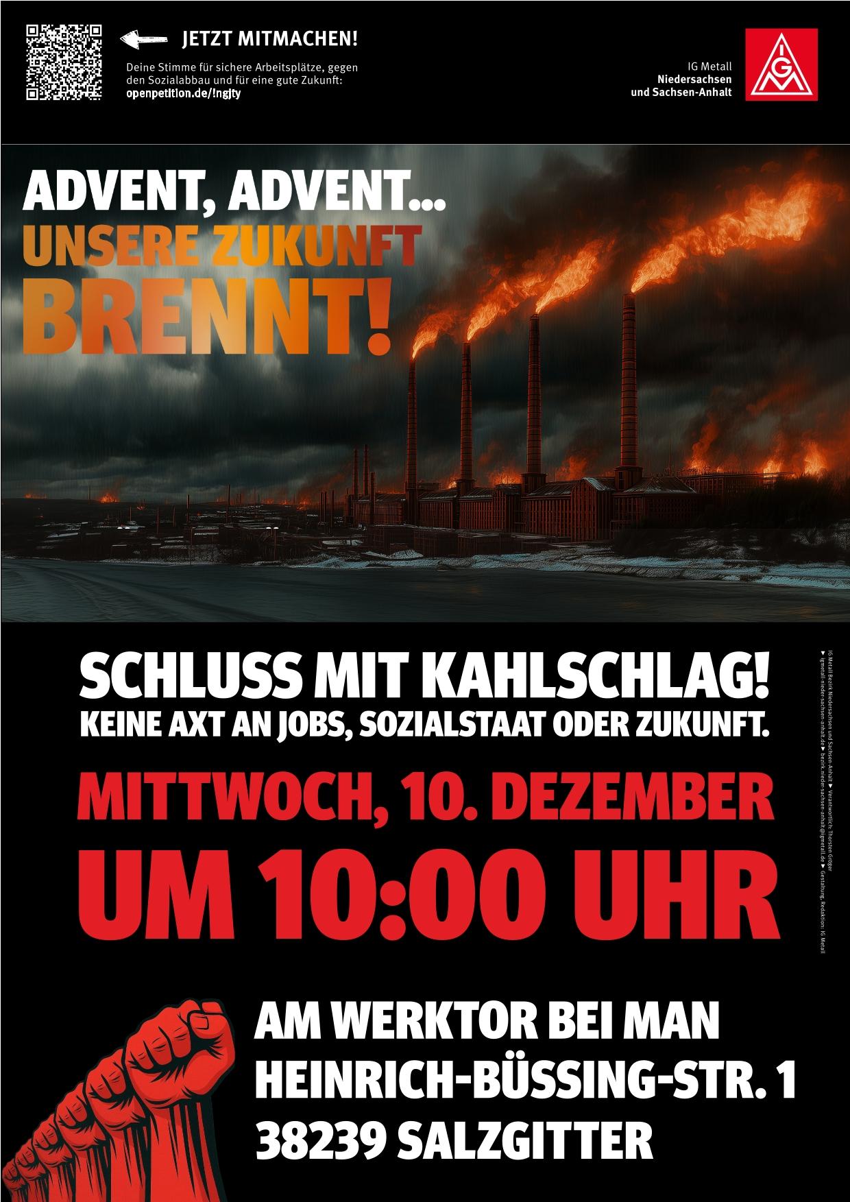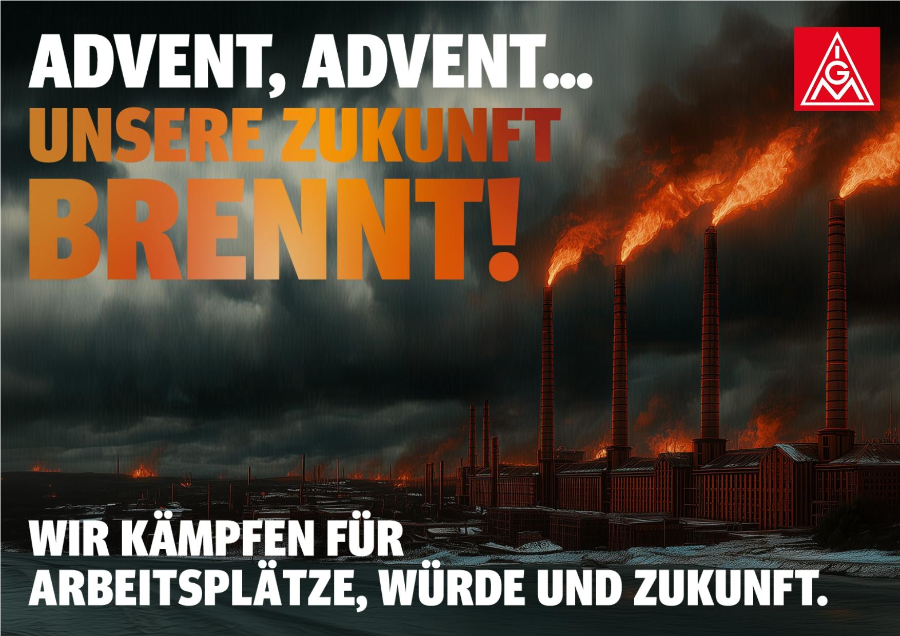 Diese Petition ist nur ein Baustein unserer Kampagne „Advent, Advent – unsere Zukunft brennt“. In zahlreichen Regionen organisieren die IG Metall-Geschäftsstellen Aktionen, Demonstrationen mit Kundgebungen, Infoveranstaltungen, sind sichtbar bei Betriebsversammlungen oder werden anders kreativ. Und dein eigener Erfindergeist ist gefragt!